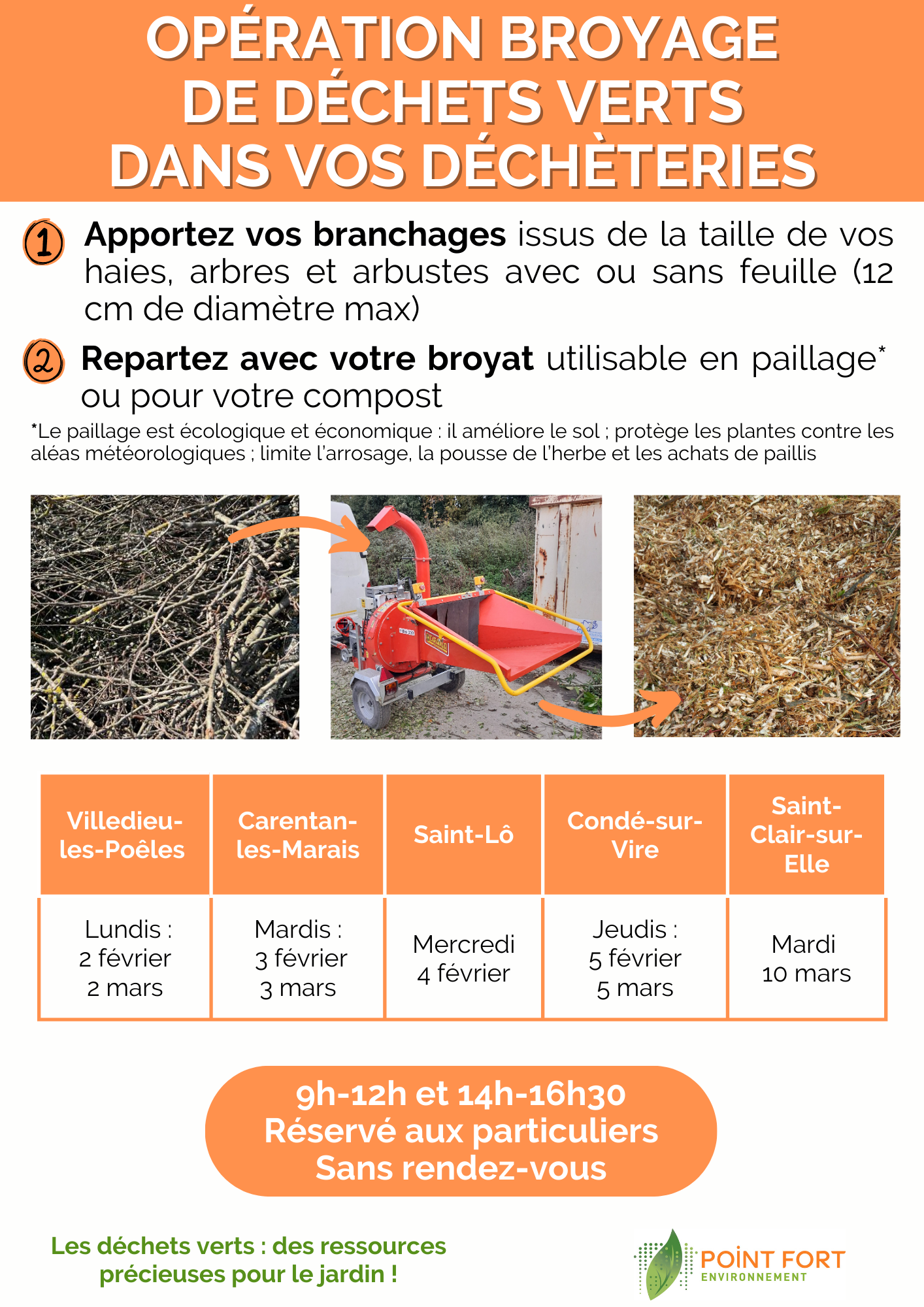 /dans Cadre de vie /par PatrickDans le cadre de ses actions en faveur de la réduction des déchets, le Point Fort Environnement poursuit ses opérations de broyage de déchets verts en déchèteries.